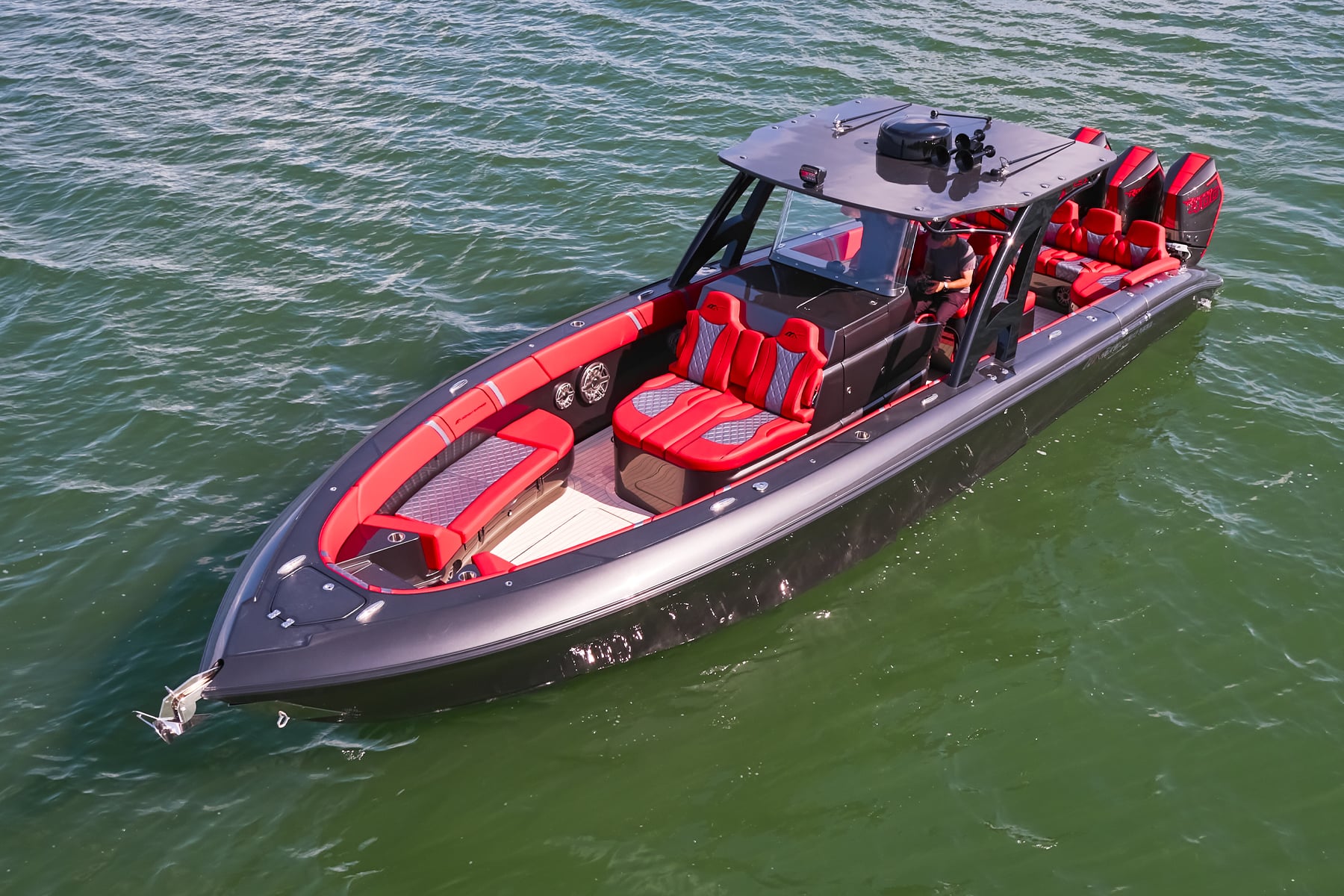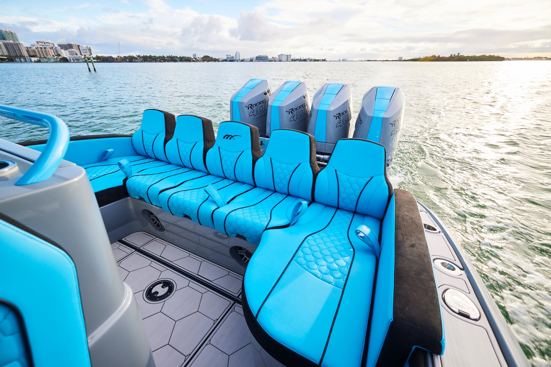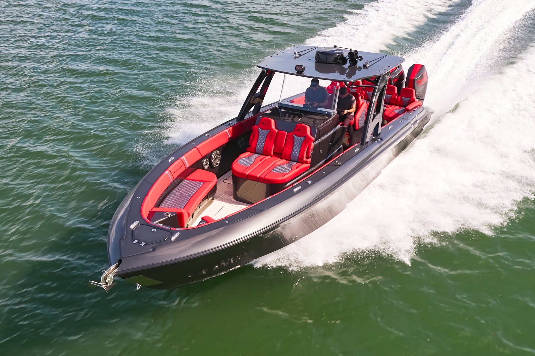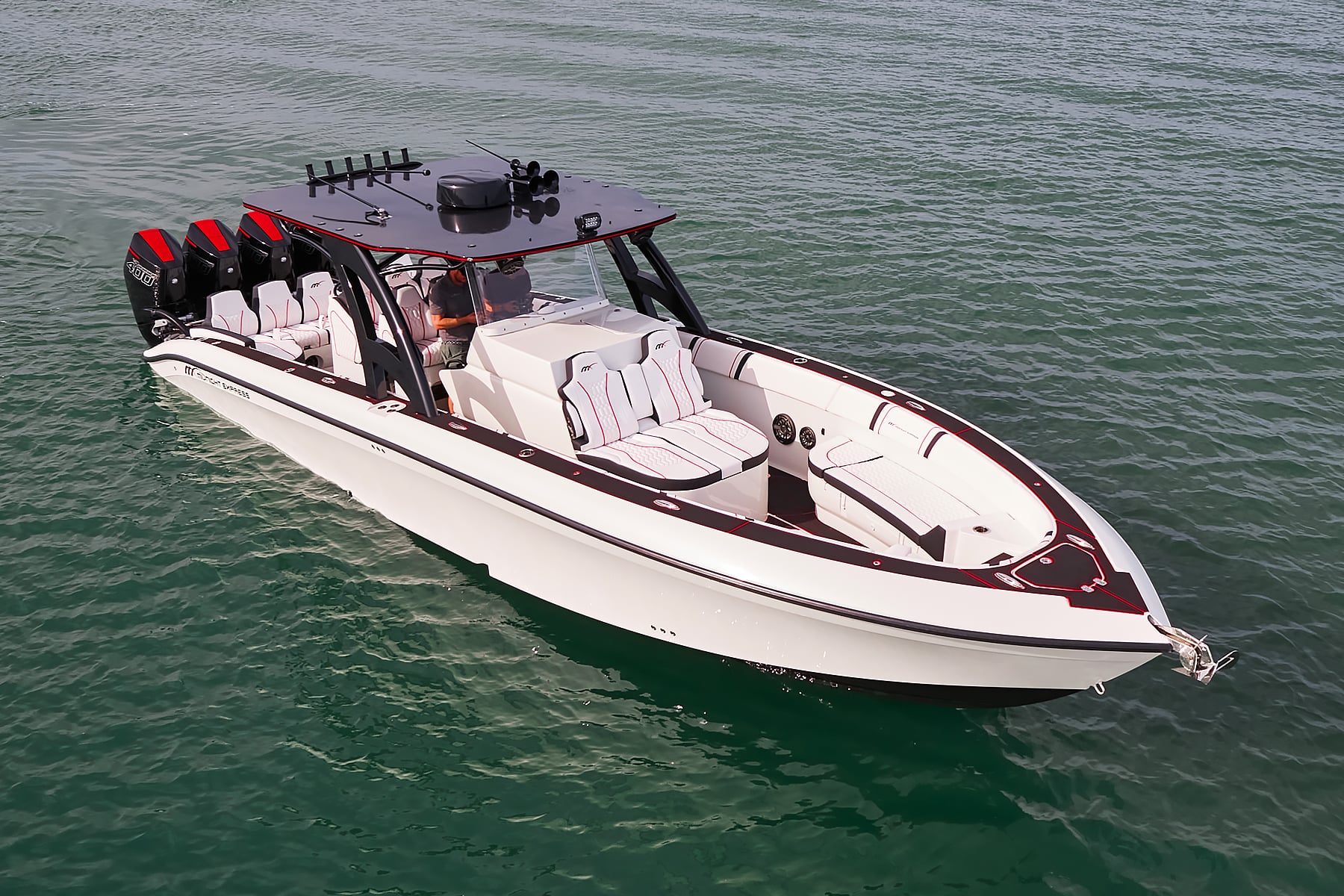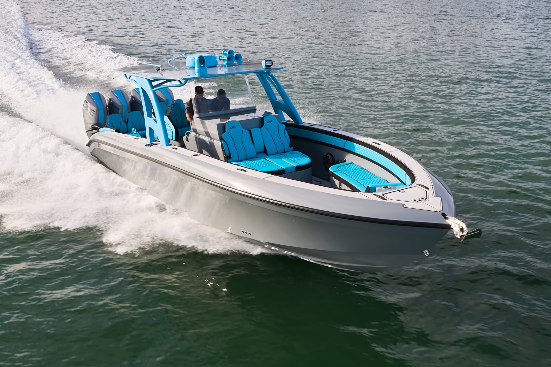 The 37′ Open can cruise easily at 40MPH+ with fuel efficiency of over 1.5 miles per gallon and achieve speeds upwards of 80MPH-90MPH+ depending on power configuration. We can configure your 37′ Open with triple or quads.