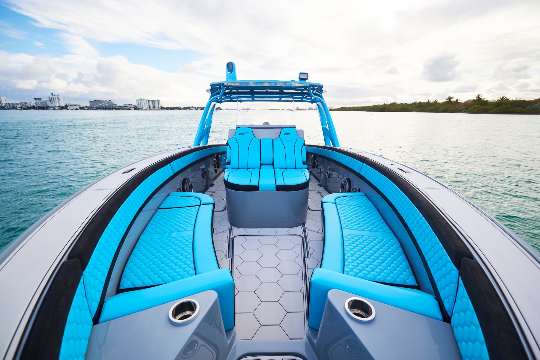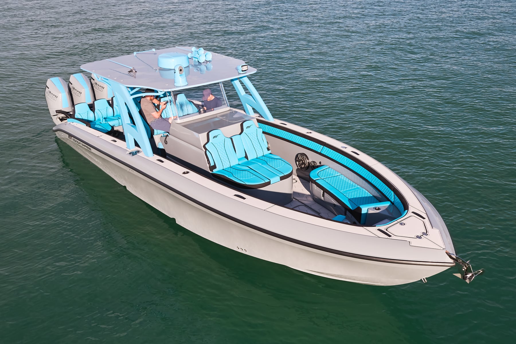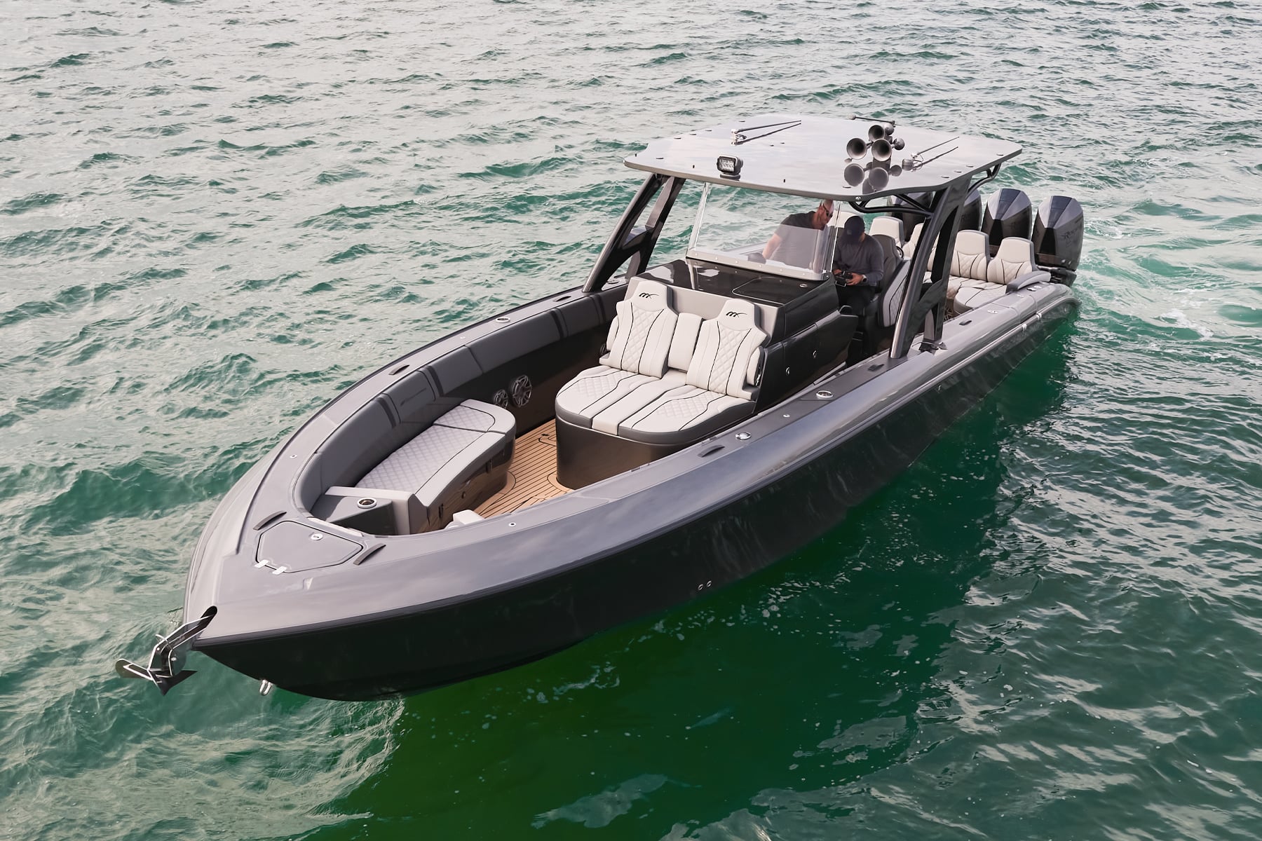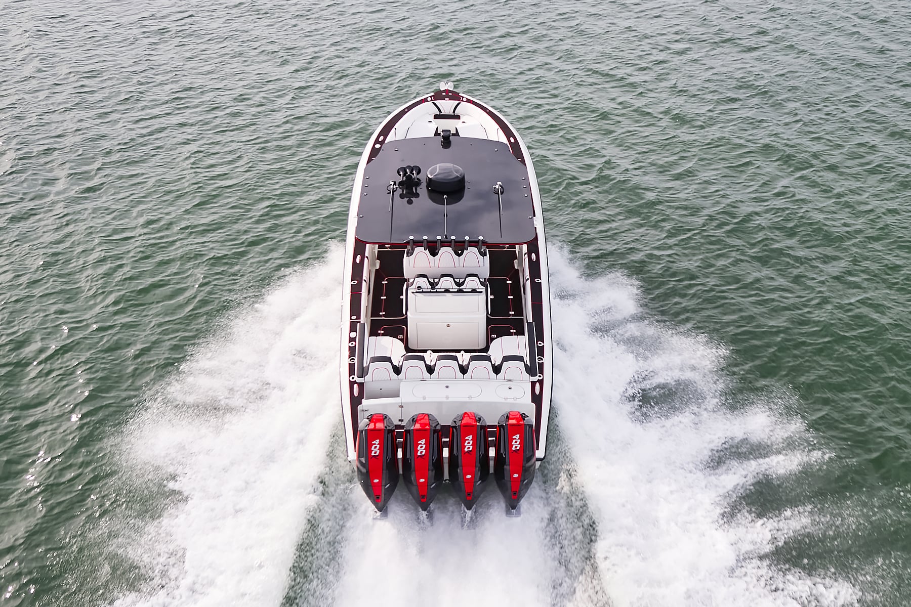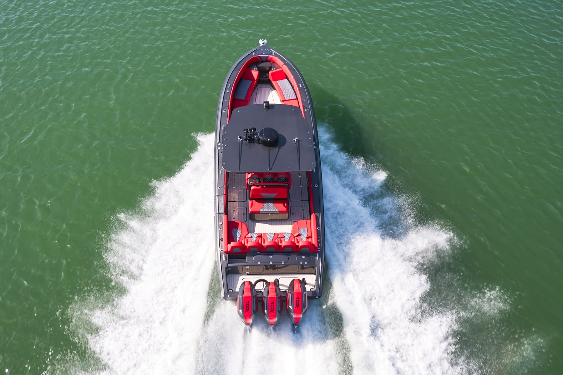 The 37′ Open can cruise easily at 40MPH+ with fuel efficiency of over 1.5 miles per gallon and achieve speeds upwards of 80MPH-90MPH+ depending on power configuration. We can configure your 37′ Open with triple or quads.