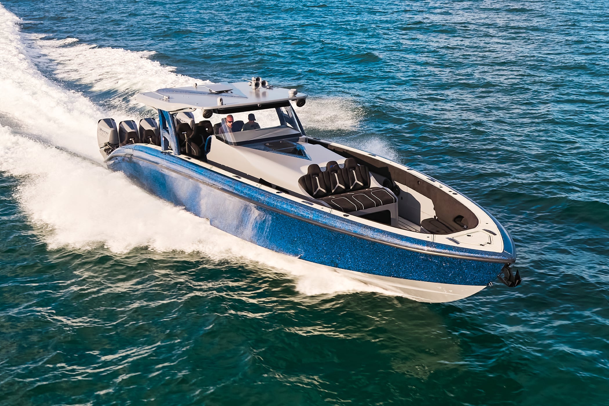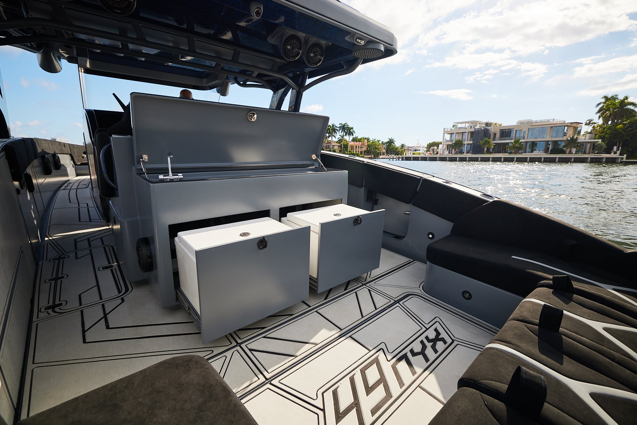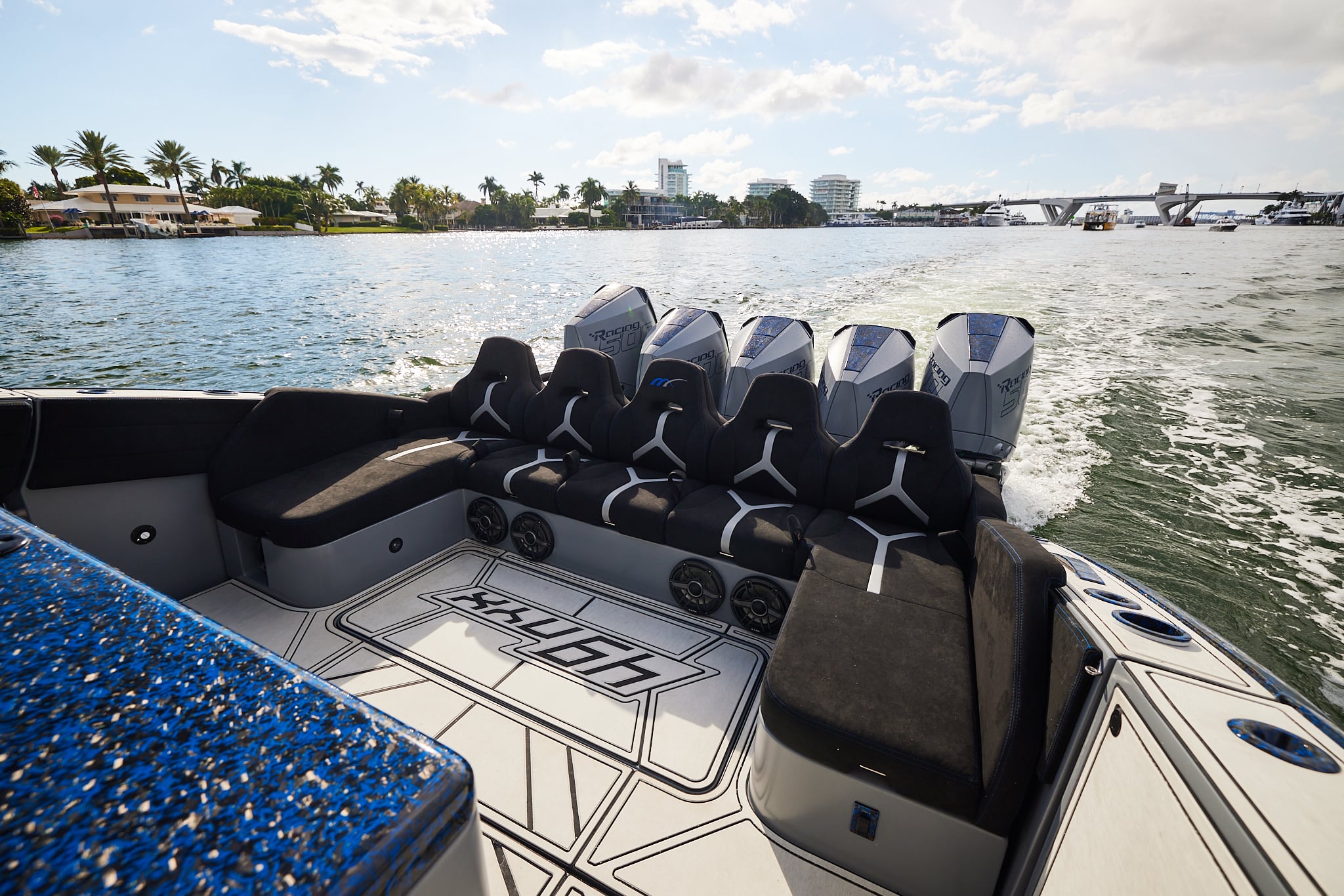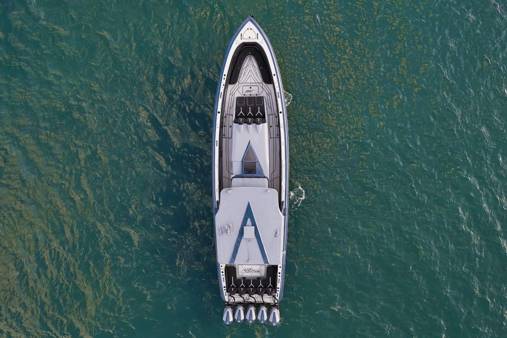 With a 600-gallon fuel capacity and quad or quint power, the 49’ Nyx delivers serious range and speeds up to 90+MPH. Beneath it all, a fully cored, resin-infused hull ensures a lightweight, ultra-strong foundation for speed, and offshore capability no matter the conditions.