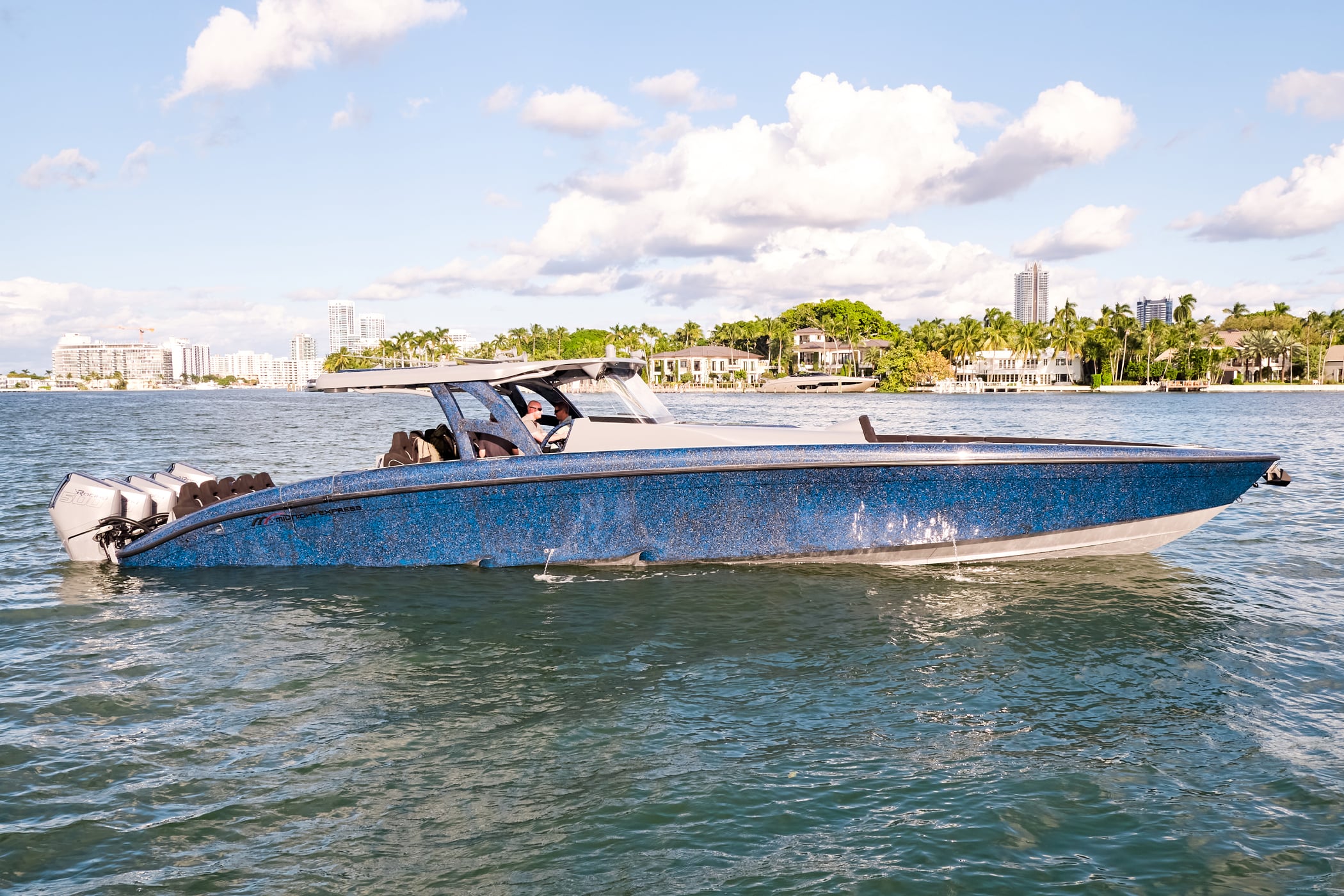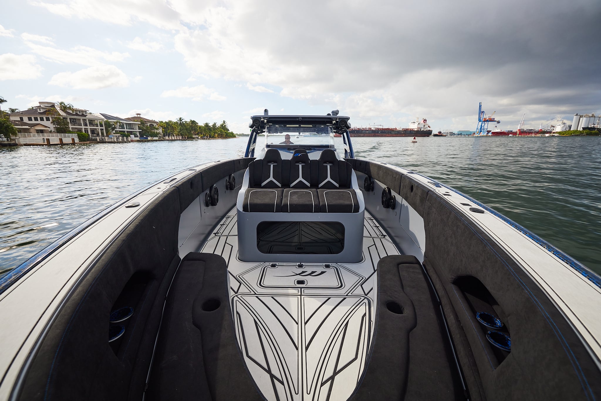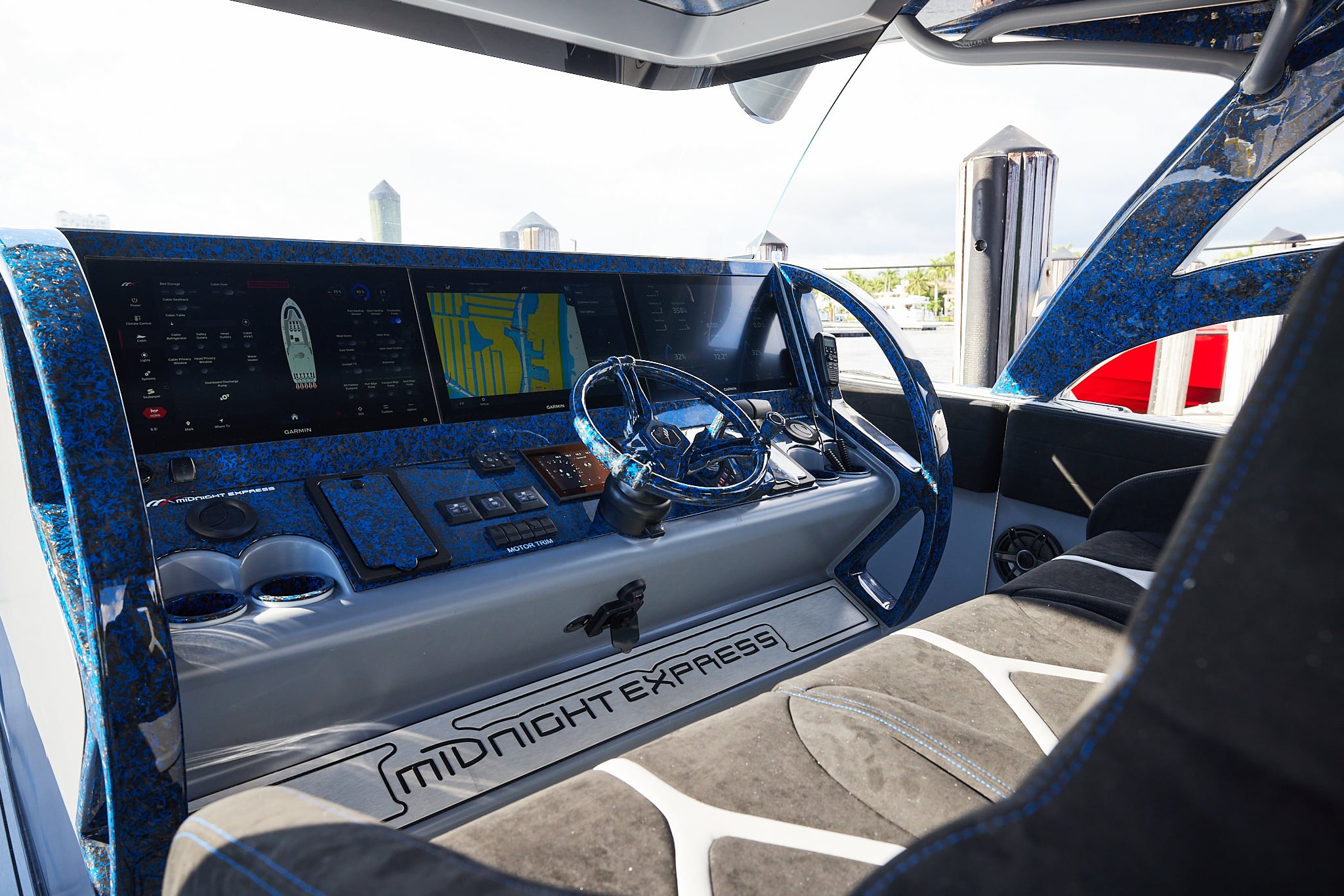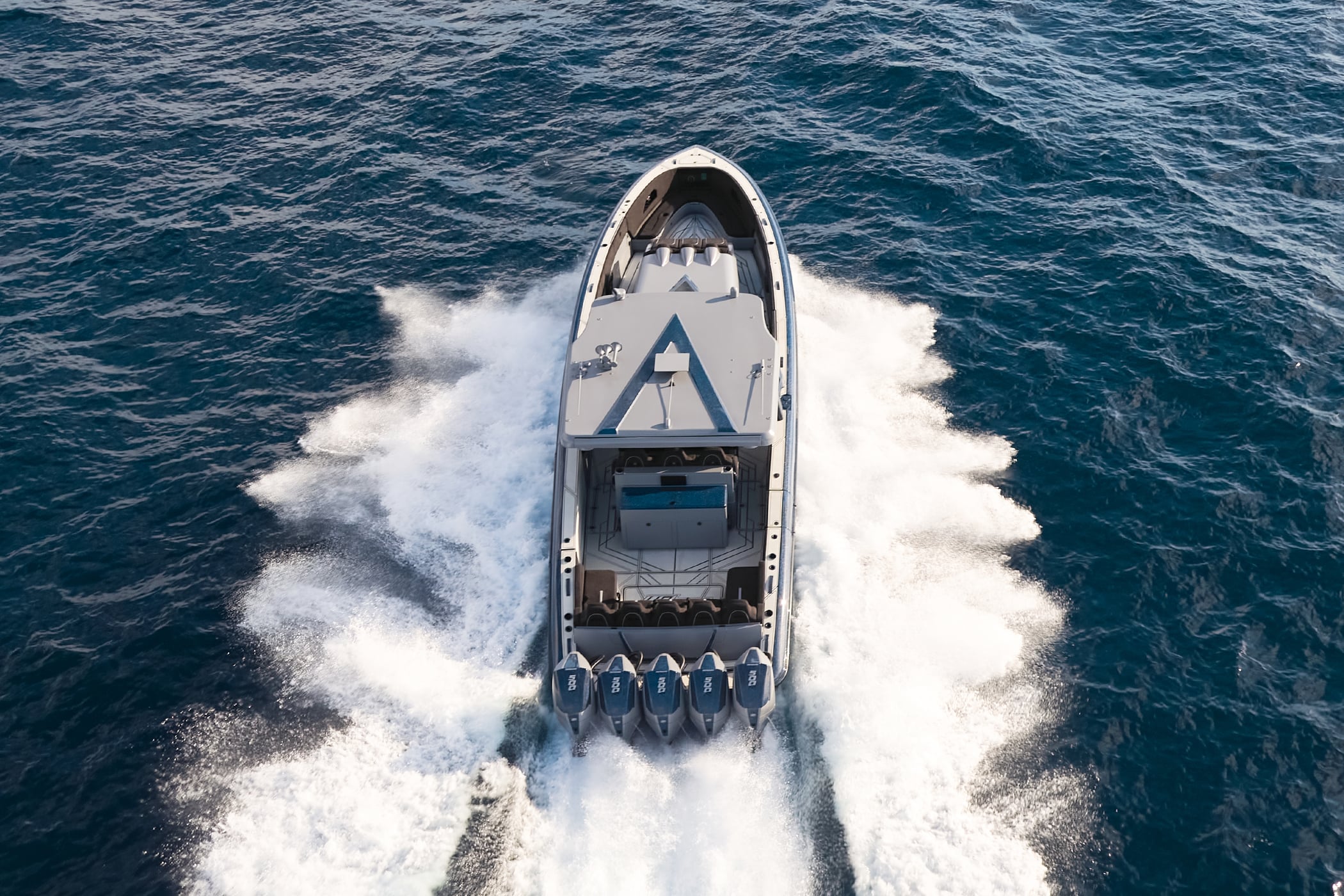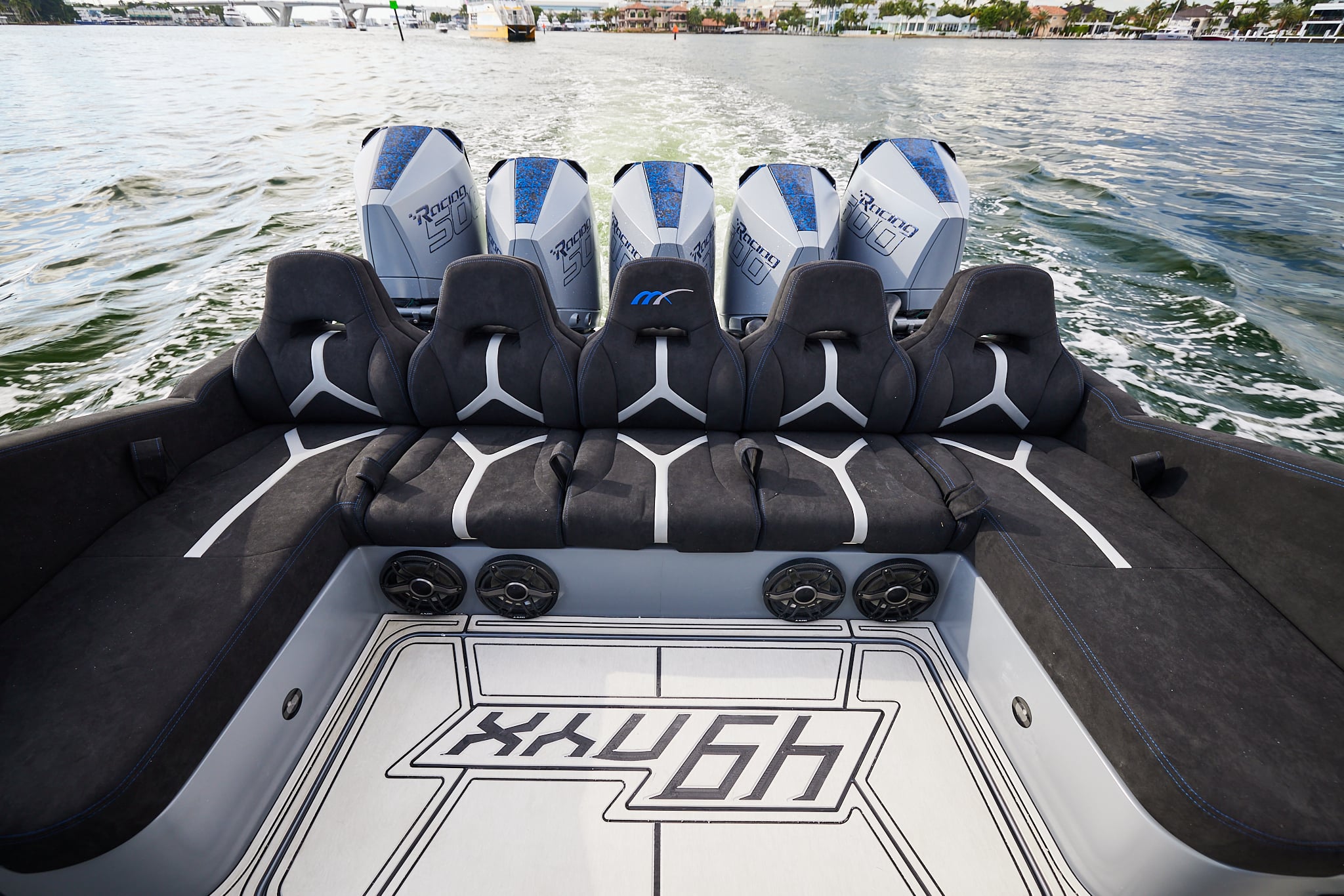 With a 600-gallon fuel capacity and quad or quint power, the 49’ Nyx delivers serious range and speeds up to 90+MPH. Beneath it all, a fully cored, resin-infused hull ensures a lightweight, ultra-strong foundation for speed, and offshore capability no matter the conditions.