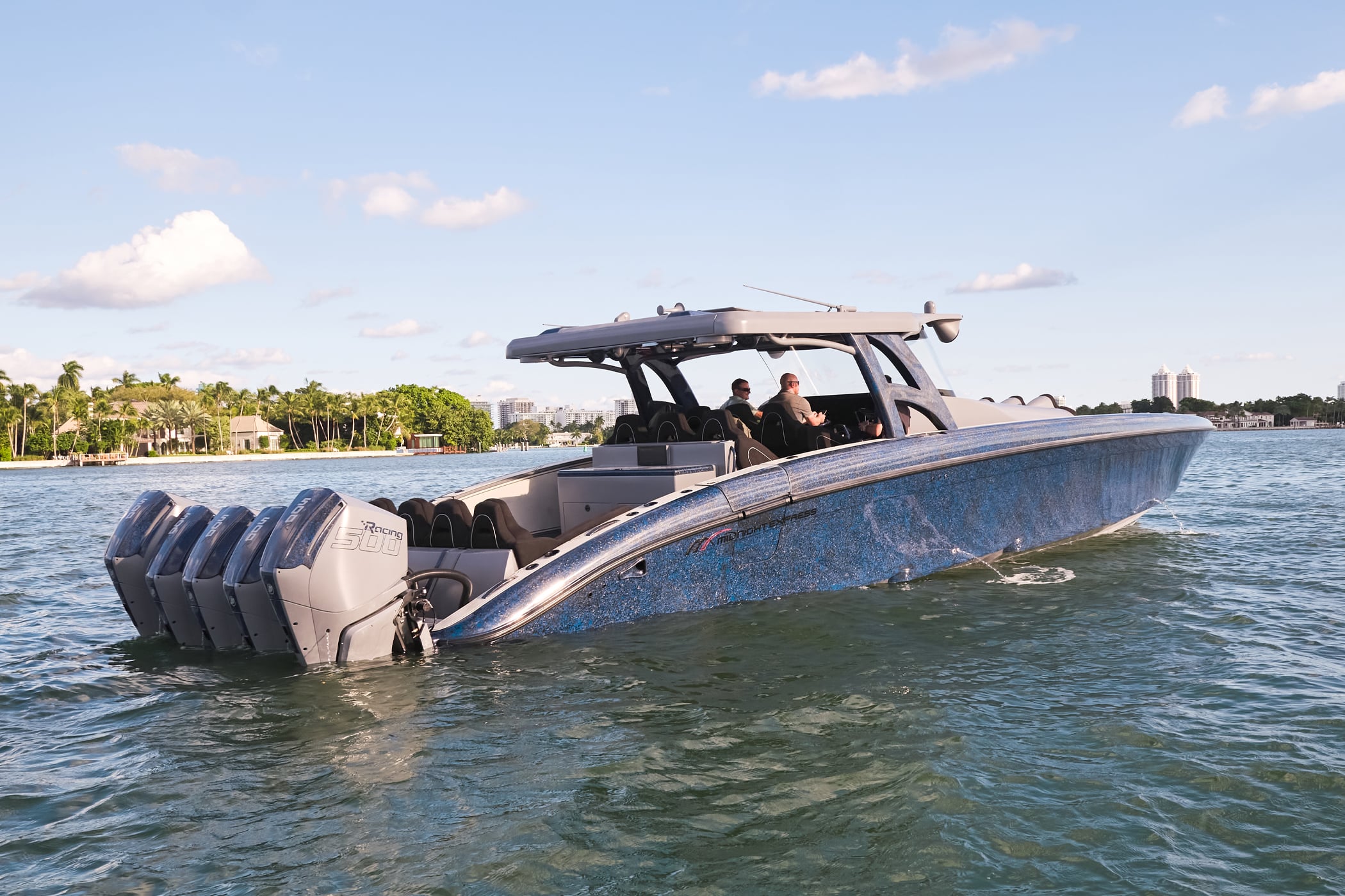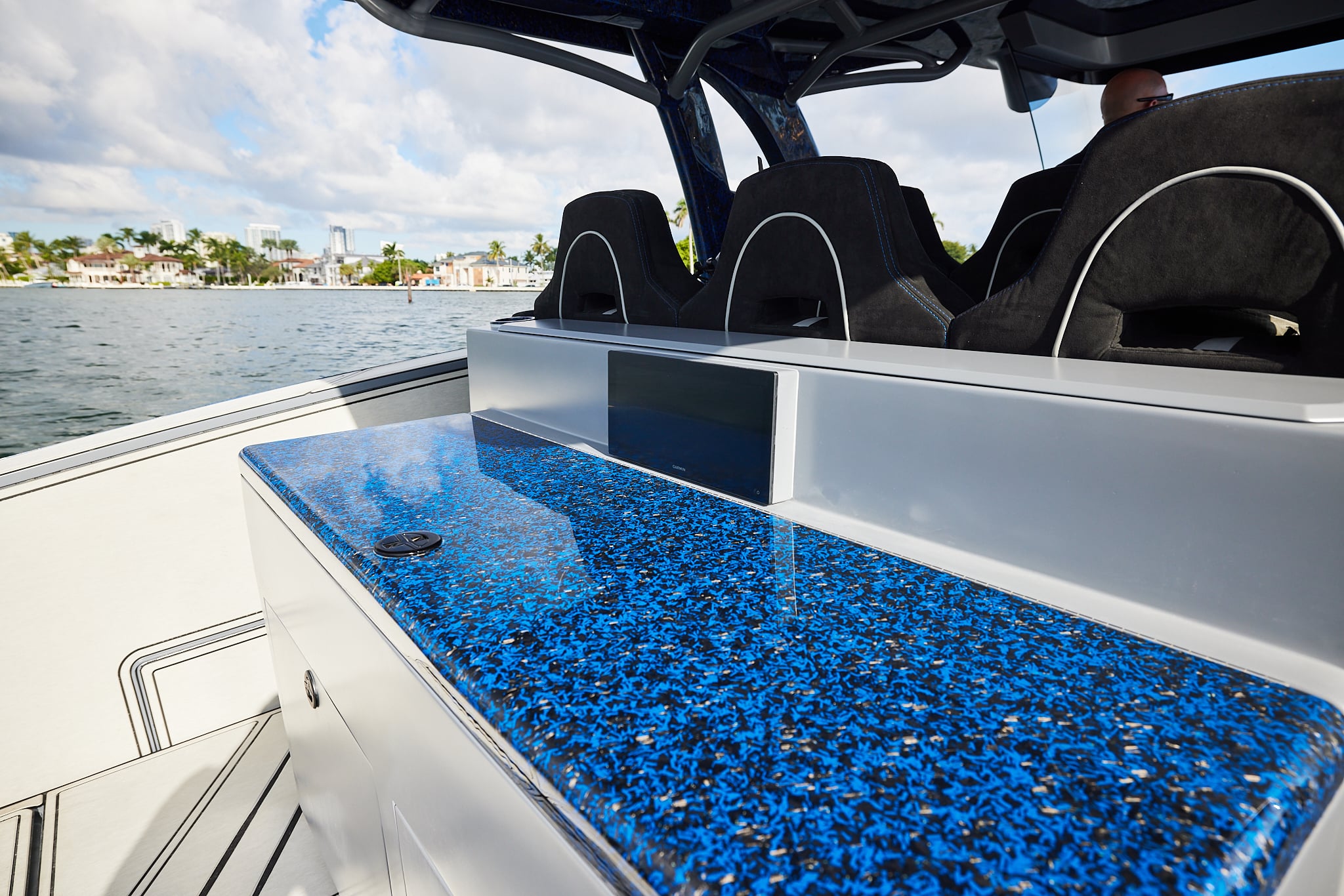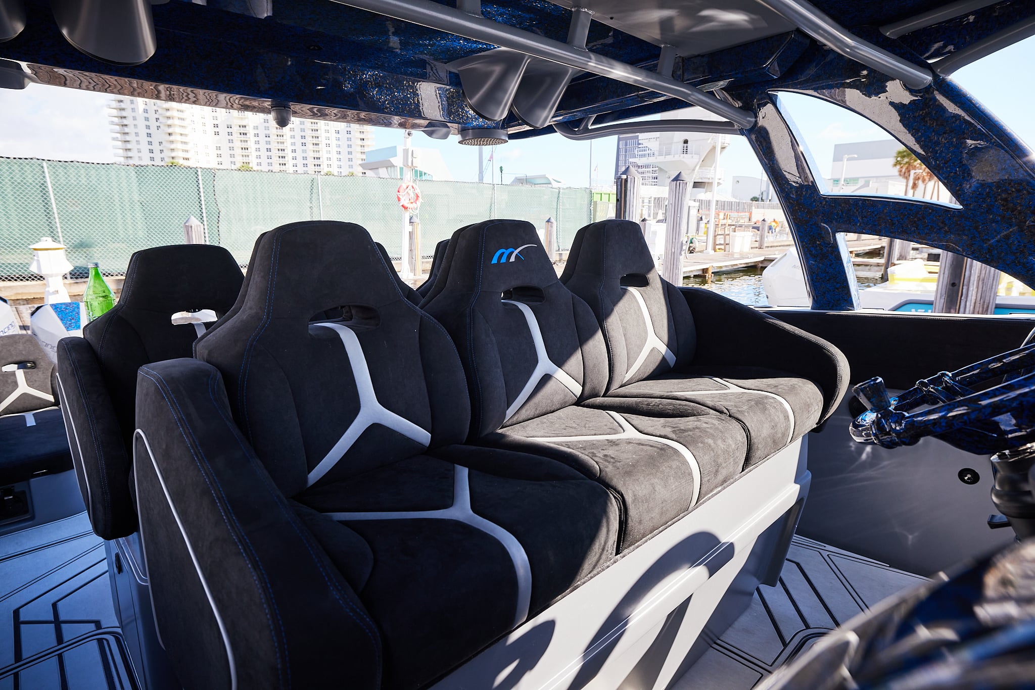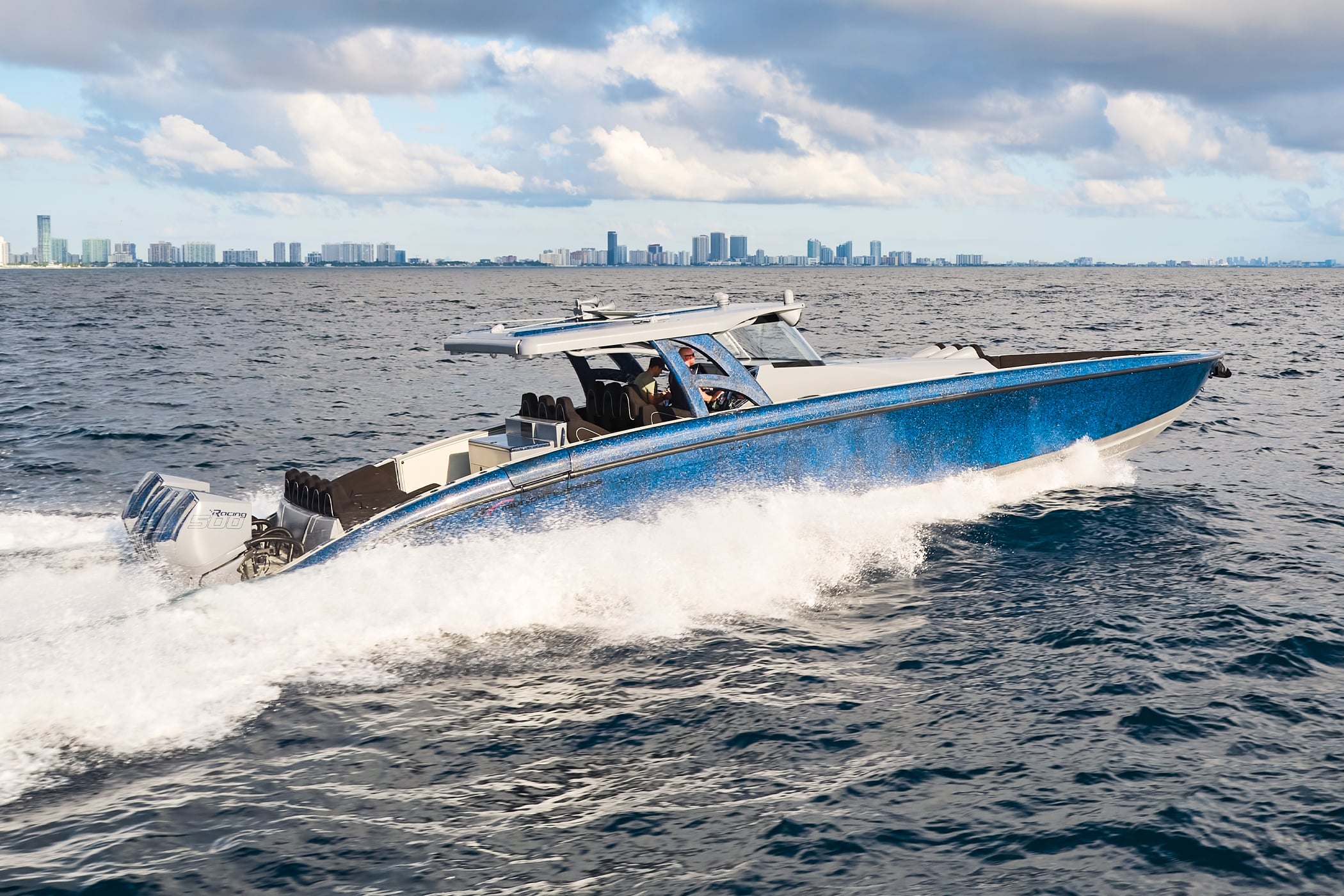 With a 600-gallon fuel capacity and quad or quint power, the 49’ Nyx delivers serious range and speeds up to 90+MPH. Beneath it all, a fully cored, resin-infused hull ensures a lightweight, ultra-strong foundation for speed, and offshore capability no matter the conditions.