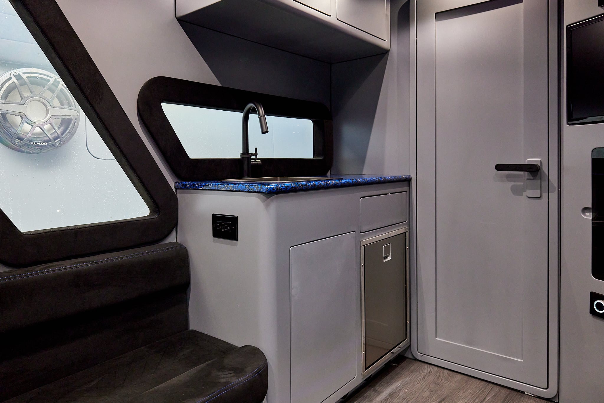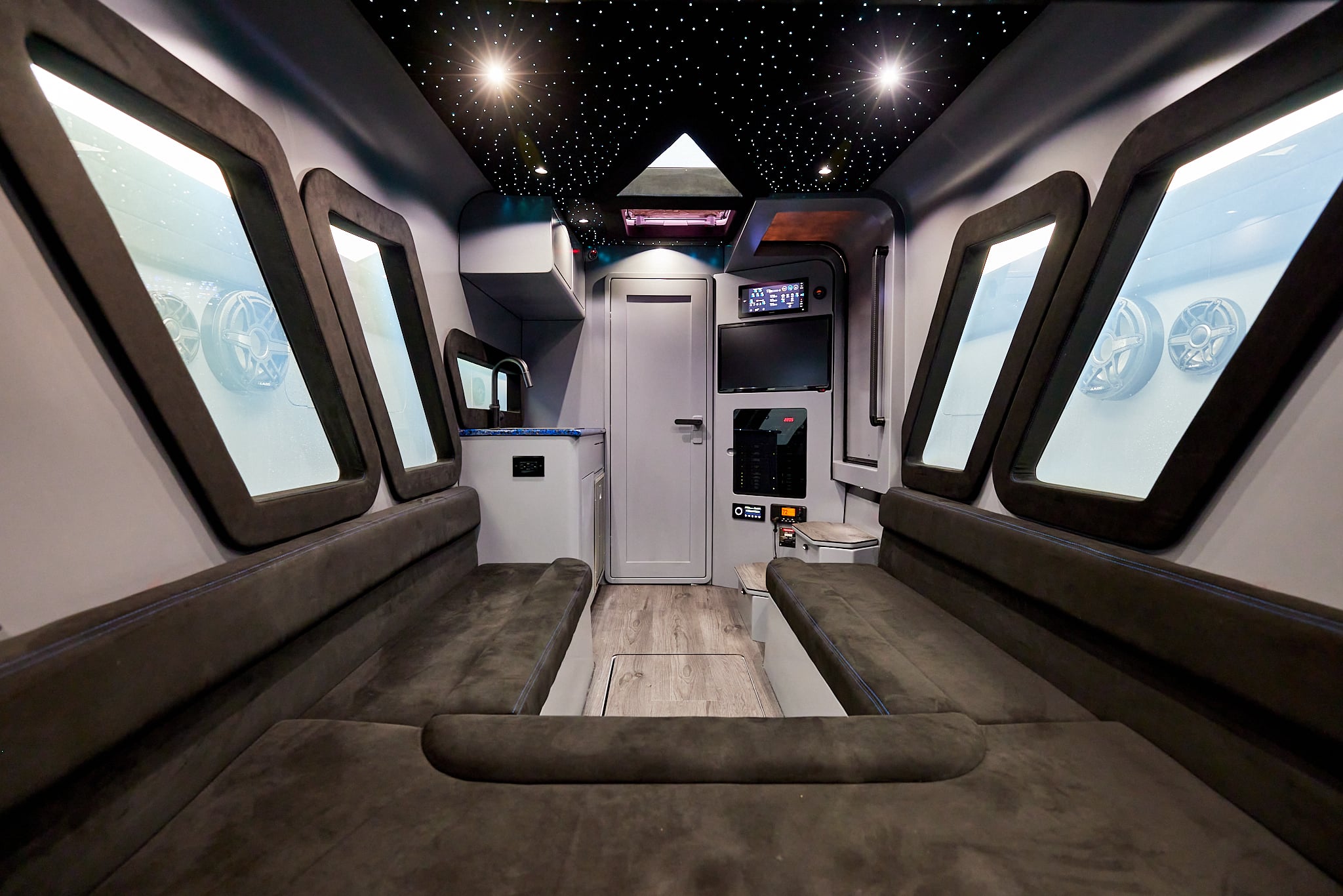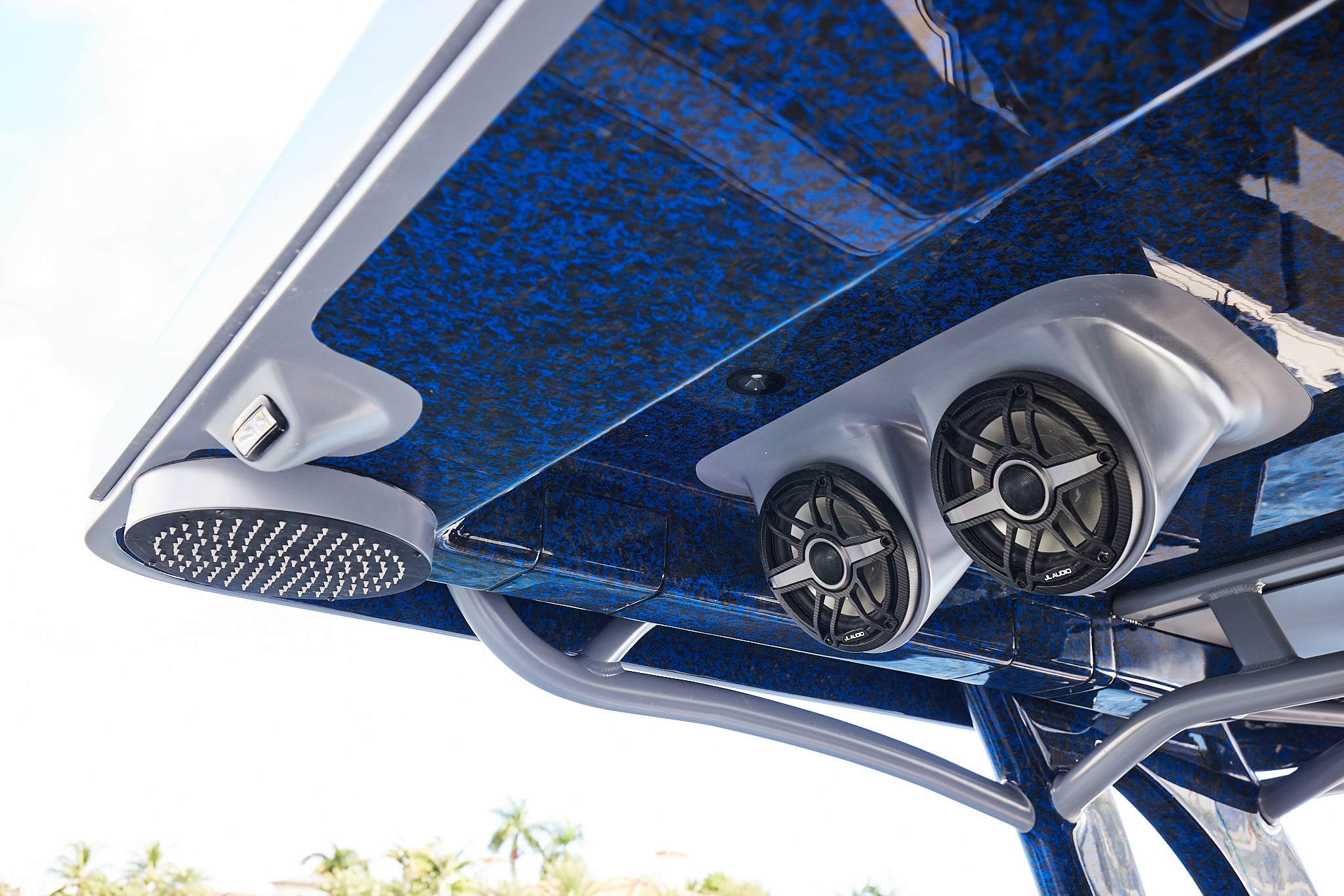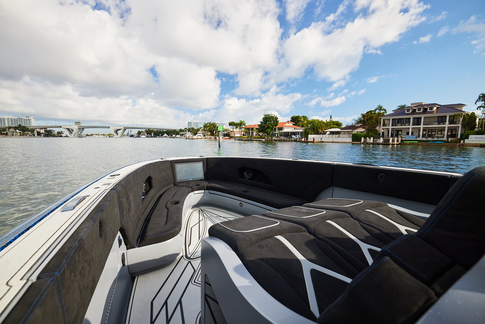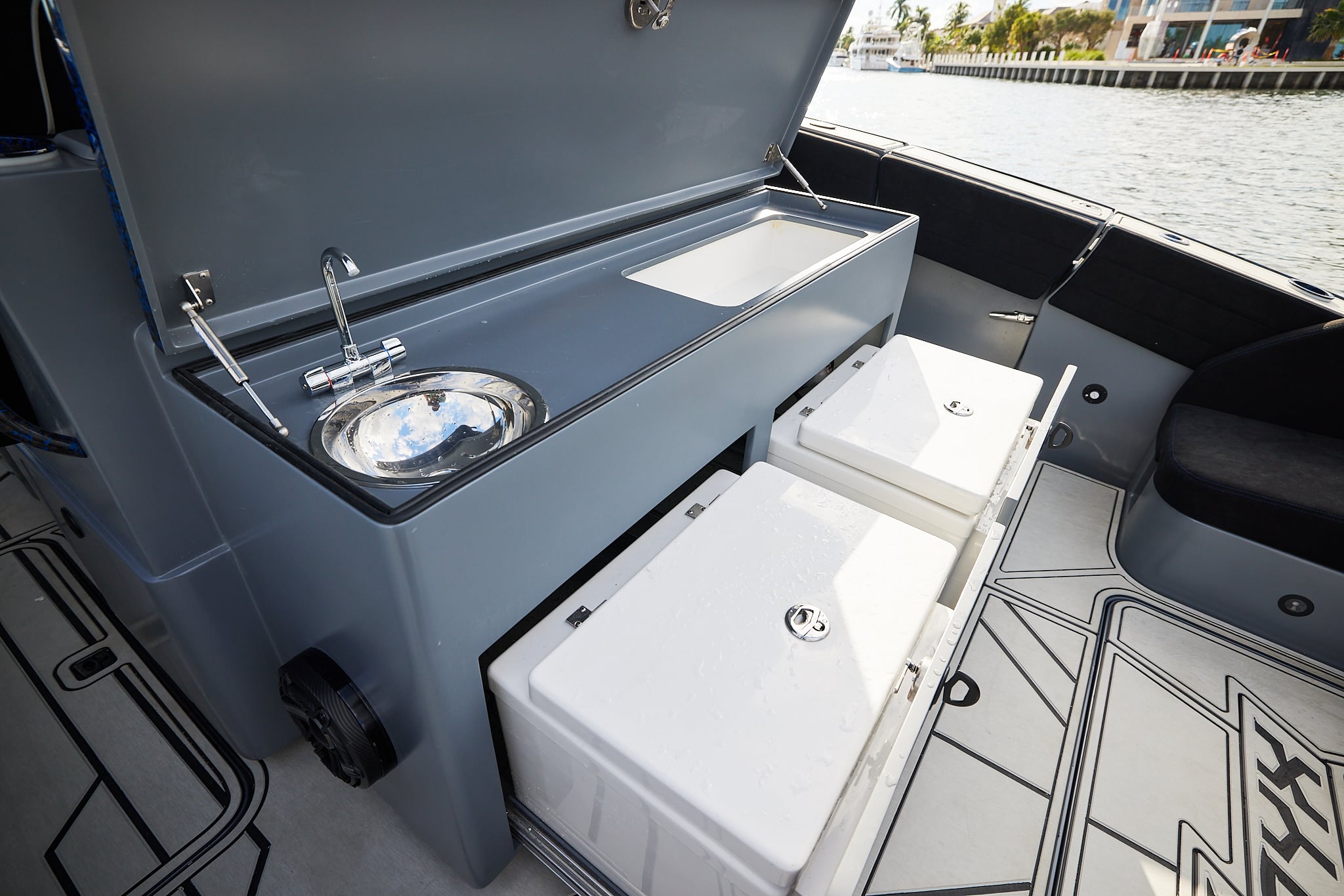 With a 600-gallon fuel capacity and quad or quint power, the 49’ Nyx delivers serious range and speeds up to 90+MPH. Beneath it all, a fully cored, resin-infused hull ensures a lightweight, ultra-strong foundation for speed, and offshore capability no matter the conditions.