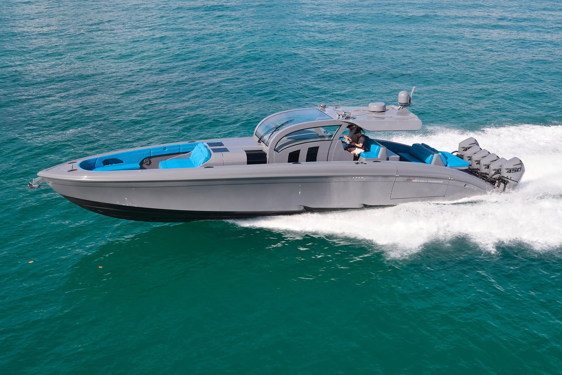 Choose from quad, quint, sext, or inboard configurations to meet your needs. Capable of speeds in excess of 80MPH, the 52’ Vitesse feels unlike anything else on the water, with open sea capabilities to take you where you want to go. Midnight Express infusion construction paired with select Carbon Fiber sections, make the 52’ Vitesse both agile and nimble but rugged and refined to create a ride unparalleled in the industry.